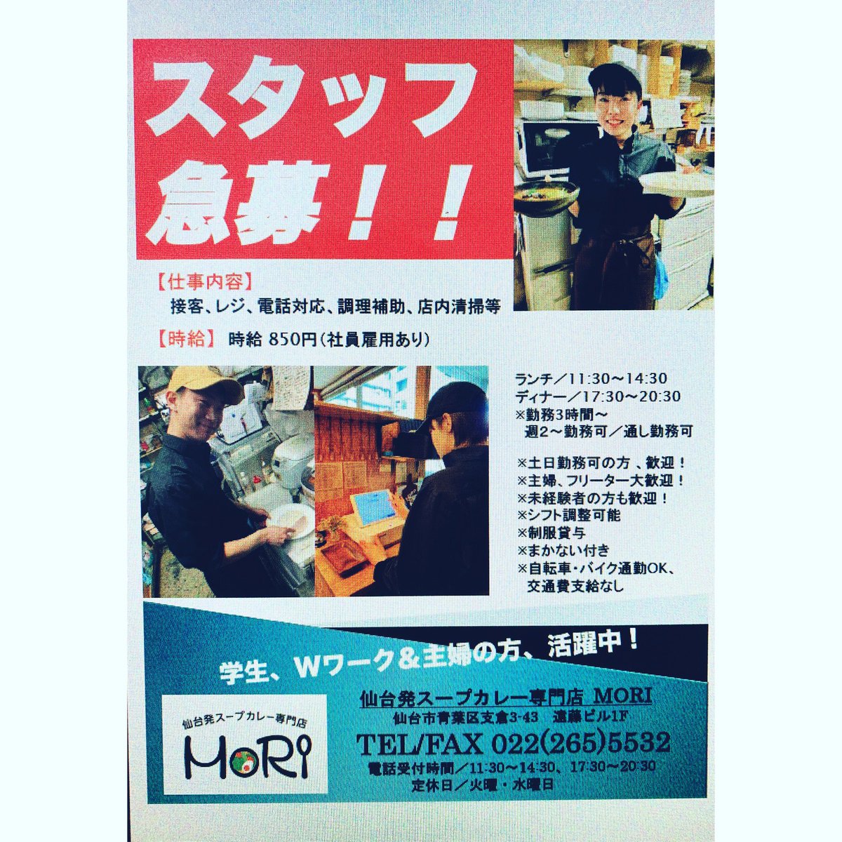 仙台発スープカレー専門店MORI(@soupcurryMori) さんが募集してる仕事