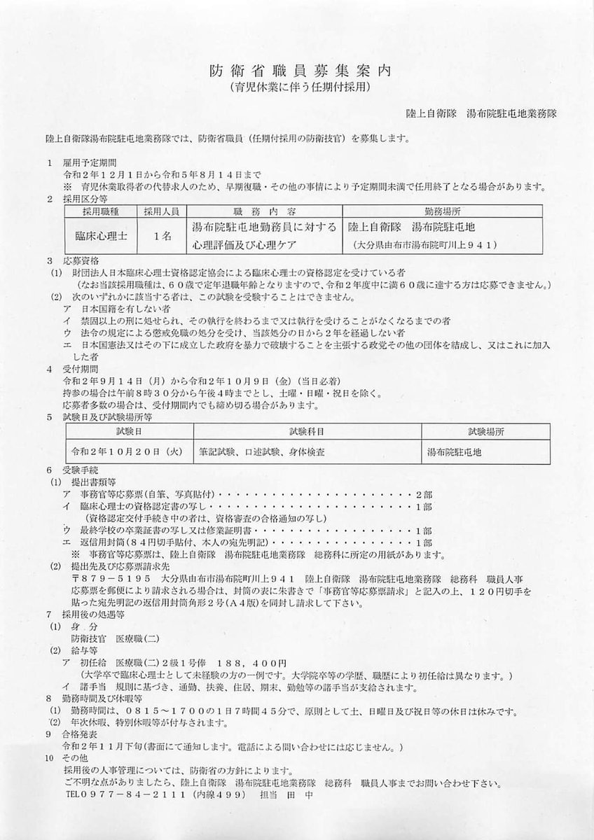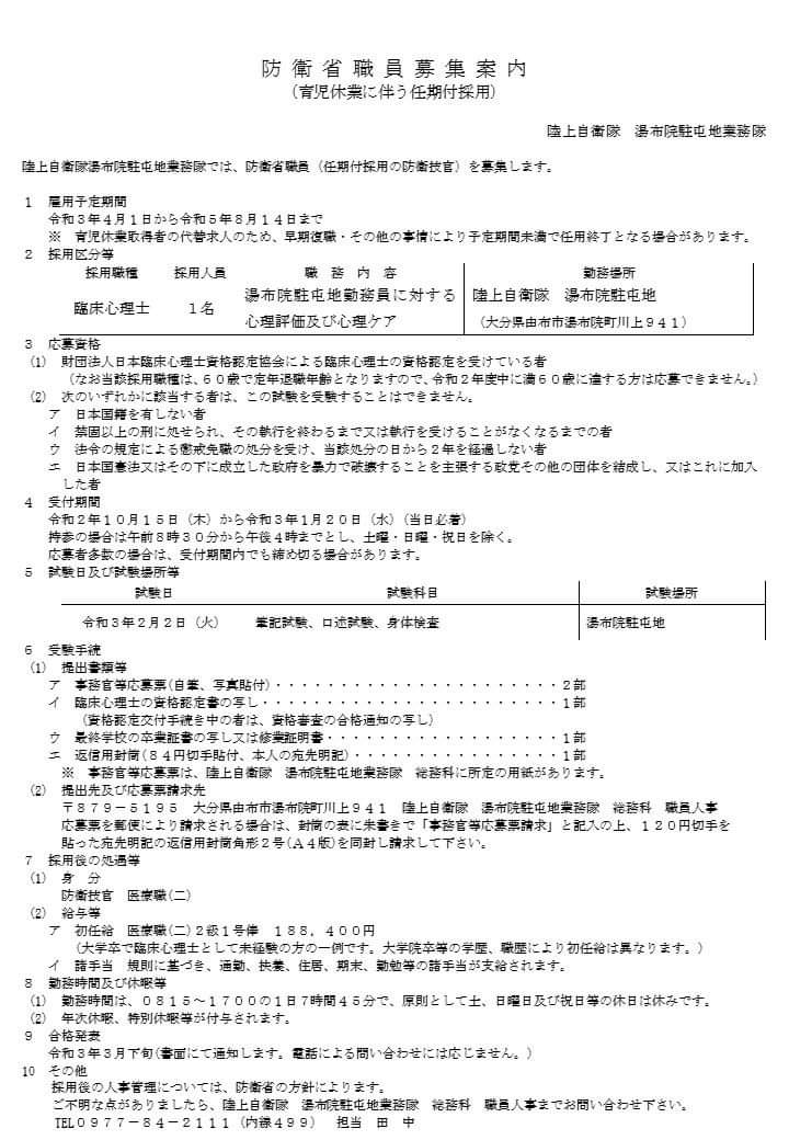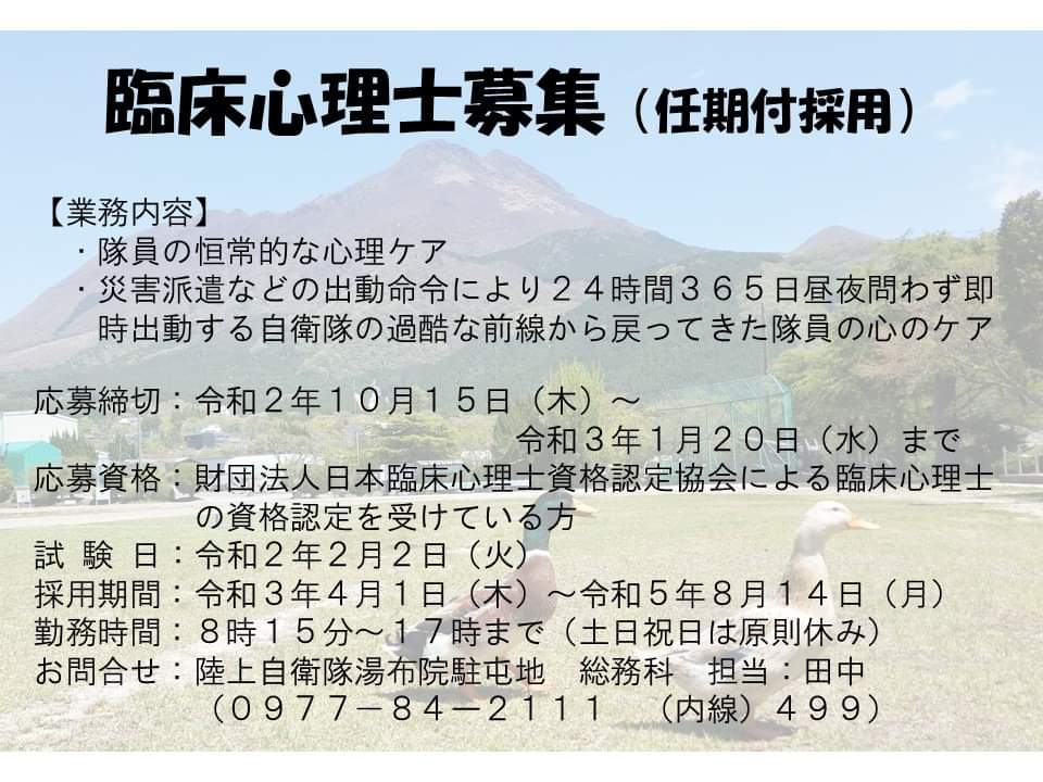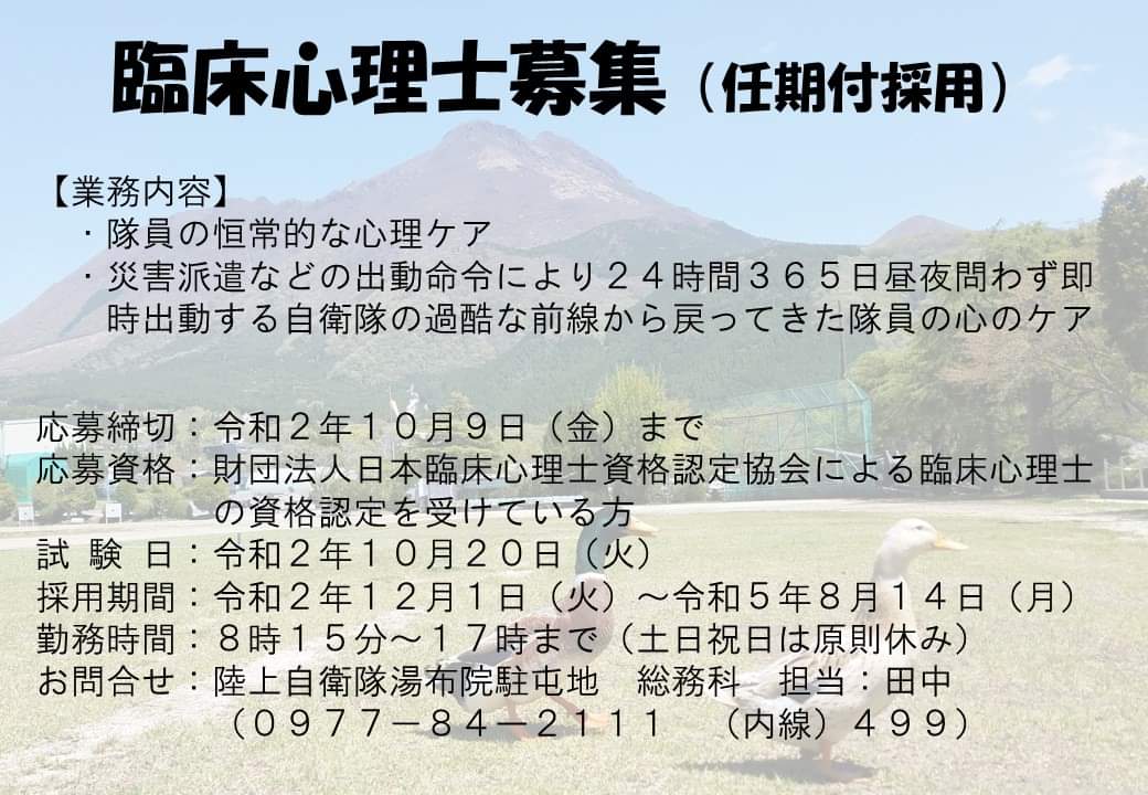 湯布院駐屯地で僕たちと一緒に勤務してくれる臨床心理士さんを募集しているグワ♪