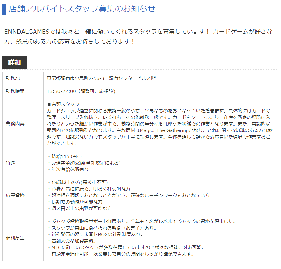 カードショップENNDAL GAMESでは現在アルバイトスタッフを募集しています!
